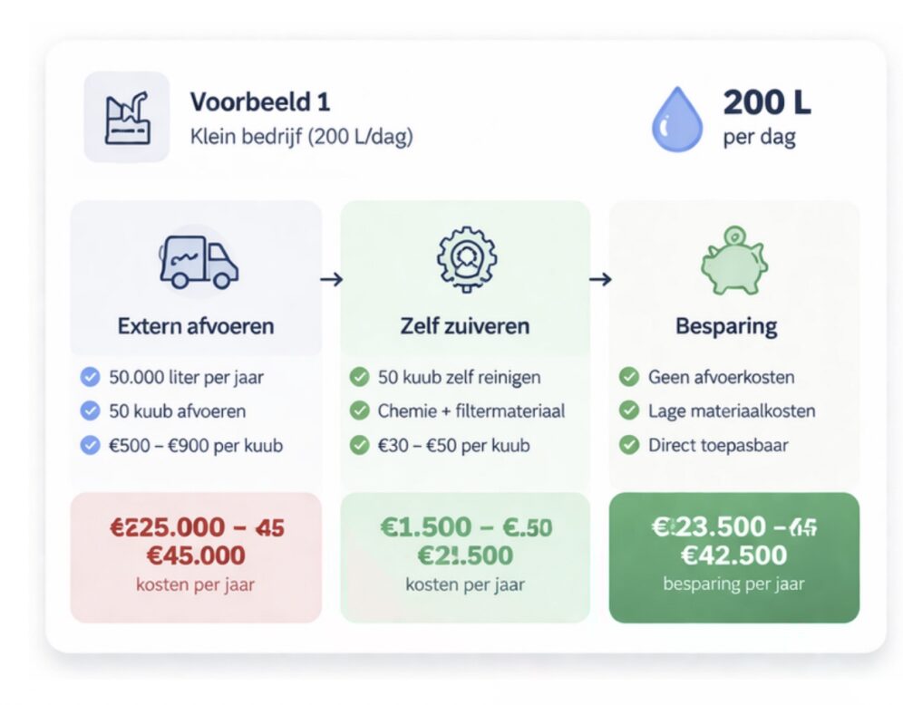 - Resultaat: U houdt 96% schoon filtraatwater over dat voldoet aan de normen van het waterschap en direct geloosd mag worden. De overige 4% is droog slib (chemisch afval), wat uw afvoerkosten geminimaliseerd.